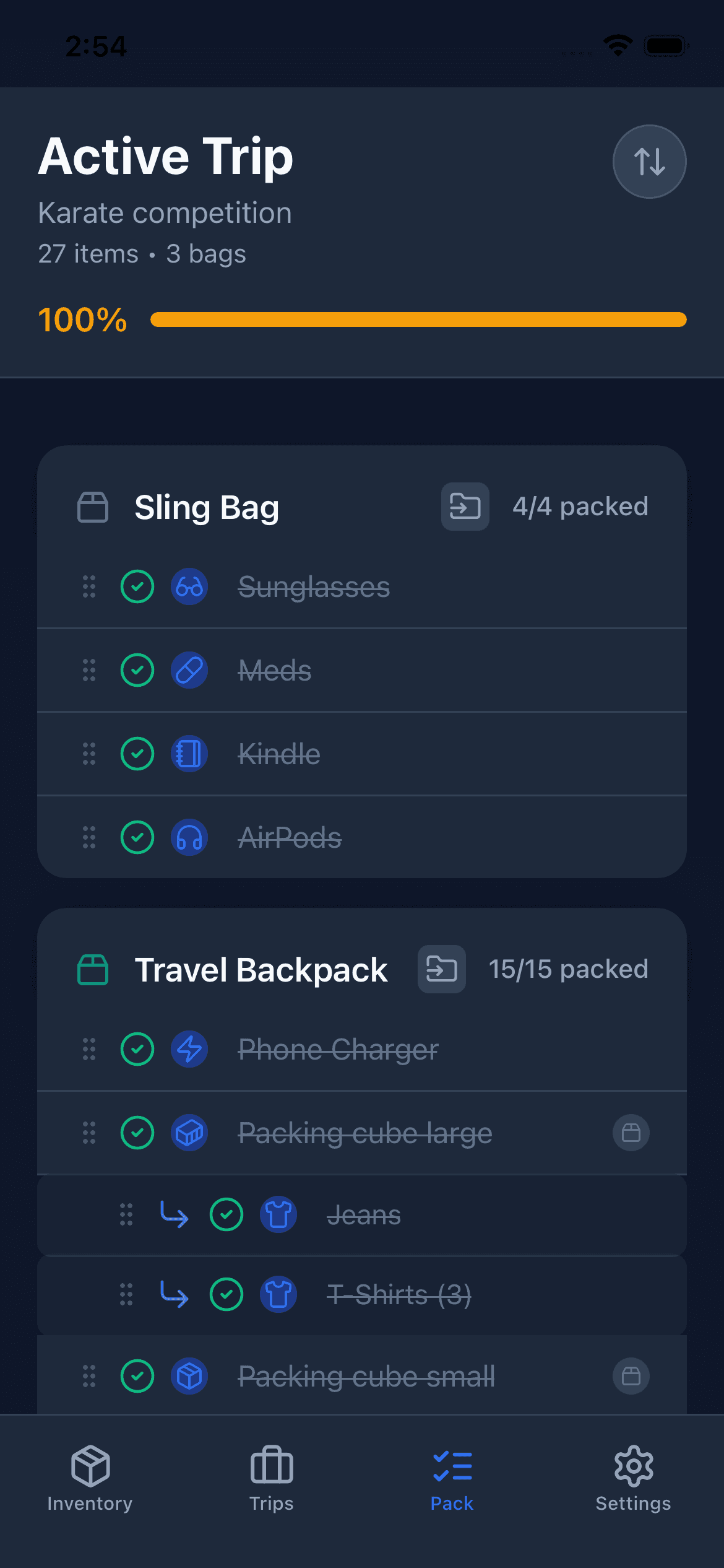 Mark off items as you pack them. See at a glance what's ready and what you're still missing, and from which bag. Travel stress-free.